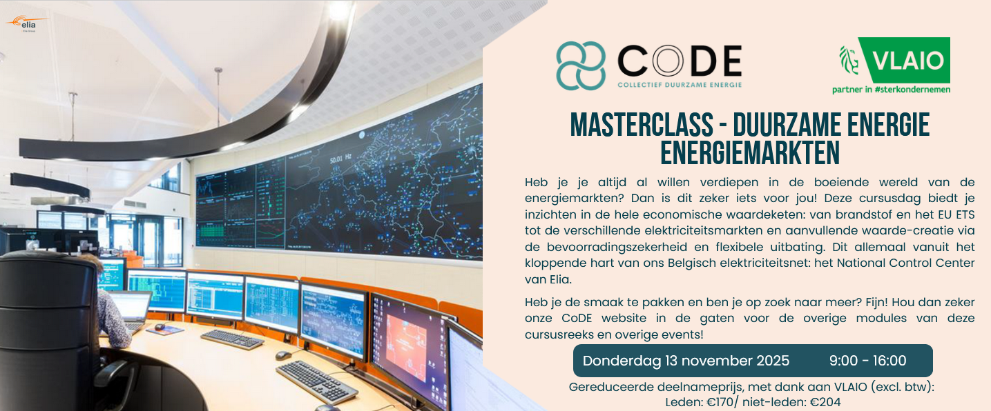 Vanuit het cursuslokaal kijk je binnen in de crisis room en National Control Center van Elia waar het allemaal live gebeurt op het einde van deze bezoeken we deze plekken ook. Voor deze masterclass hanteren we een klassikale setup zodat er vragen gesteld kunnen worden aan de experts en er in discussie kan worden gegaan. Dit betekent ook een numerus clausus van 20 personen. Als je er bij wilt zijn, schrijf je dan zeker snel in (voor 6/11/25!) via deze link, want de plekjes zijn gegeerd. https://www.cogenvlaanderen.be/masterclass-duurzame-energie-2025-2026-energiemarkten