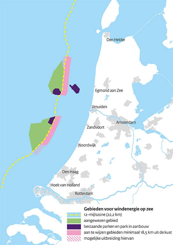 Aan de al eerder aangewezen gebieden voor de Noord- en Zuid-Hollandse kust wil het kabinet een smalle strook toevoegen. De windparken komen grotendeels op minimaal 22 kilometer (12 mijl) afstand van de kust. Alleen bij twee gebieden voor de Zuid-Hollandse en Noord-Hollandse kust wordt een smalle strook windmolens dichter bij de kust toegevoegd, op minimaal 18,5 kilometer (10 mijl).