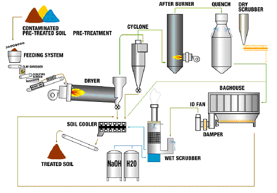 De rookgassen van de naverbrandingsinstallaties van thermische grondreinigingsinstallaties bevatten een relatief laag gehalte aan dioxines, wanneer grond verontreinigd met gehalogeneerde koolwaterstoffen wordt gereinigd. De rookgasreinigingsinstallaties die op dit moment in bedrijf zijn hebben aangetoond dat zij in staat zijn de norm van 0,1 ng TEQ te behalen.