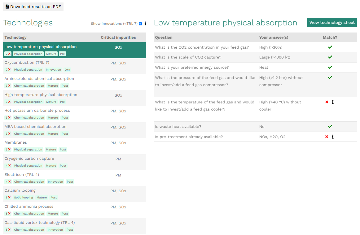 Simple, user-friendly questionnaire including basic technical parameters of the CO₂ stream—such as concentration, temperature, and pressure.